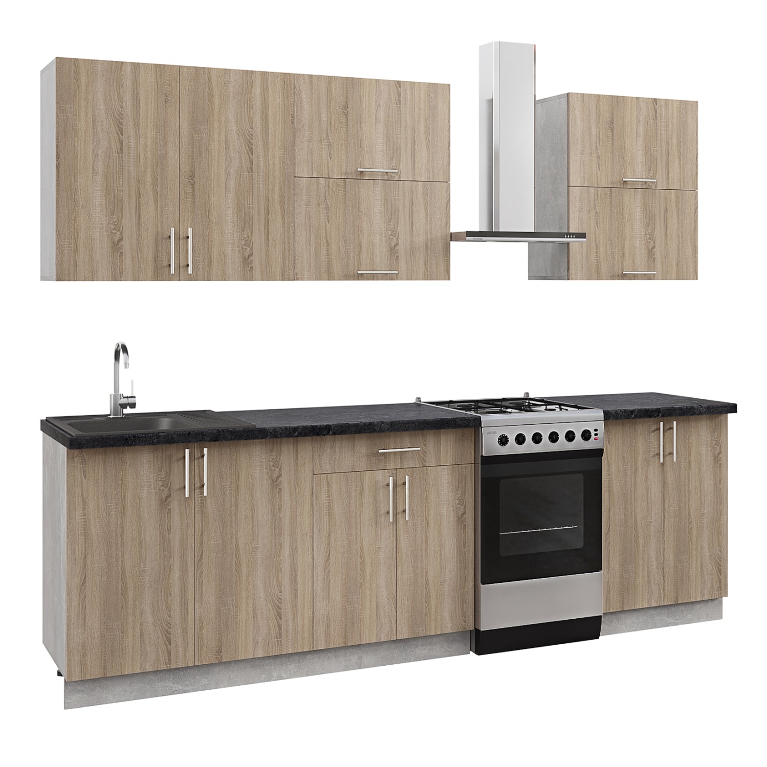 ΗΜ2469.01- Σύνθεση κουζίνας----Σας παρουσιάζουμε την καινούργια σειρά με συνθέσεις για την κουζίνα που έχουμε προσθέσει στην γκάμα μας. Αυτή η σύνθεση είναι σε μεγάλη διάσταση και σε χρώμα σκούρο SONOMA. Τα ντουλάπια του τοίχου αποτελούνται από 1 διπλό ντουλάπι και 4 ντουλάπια με πόρτες που ανοίγουν οριζόντια. Η επιδαπέδια μονάδα αποτελείται από 1 διπλό ντουλάπι κάτω από τον μονό νεροχύτη, ένα μακρύ συρτάρι κι ένα ακόμα διπλό ντουλάπι από κάτω, και τέλος ένα ακόμα διπλό ντουλάπι στην άκρη. Όλες οι πόρτες στα ντουλάπια έχουν μοντέρνα ΙΝΟΧ χερούλια. Οι πάγκοι της σύνθεσης έχουν χρώμα και όψη μαύρου μαρμάρου και δημιουργούν μια όμορφη διχρωμία, ενώ το υλικό κατασκευής τους σας επιτρέπει να τους χρησιμοποιείτε με άνεση γιατί είναι ανθεκτικοί σε διάφορα είδη καταπόνησης.