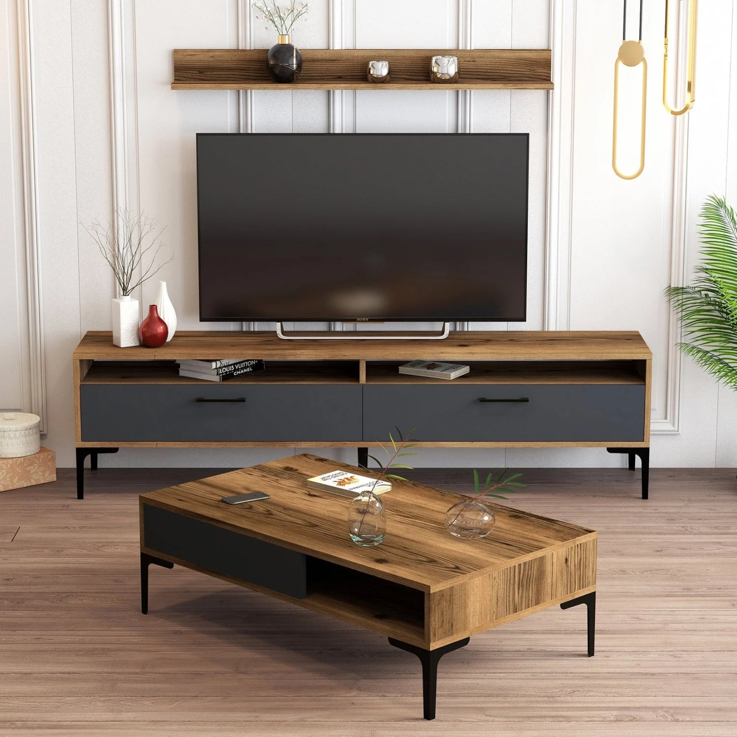Η σύνθεση ΗΜ11856.02 θα αλλάξει την όψη στο σαλόνι σας και θα σας προσφέρει την αναβάθμιση που θέλετε. Αποτελείται από έναν συνδυασμό επίπλων για την τηλεόρασή σας με μονάδα δαπέδου και επιτοίχιo ράφι και ένα τραπεζάκι σαλονιού. Όλη η σύνθεση είναι της ίδιας σειράς και τα κυρίαρχα χρώματα είναι το ΚΑΡΥΔΙ και το ΑΝΘΡΑΚΙ.