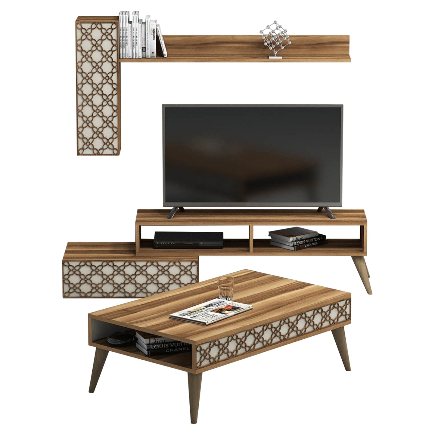 Η σύνθεση ΗΜ11850.02 θα αλλάξει την όψη στο σαλόνι σας και θα σας προσφέρει την αναβάθμιση που θέλετε. Αποτελείται από έναν συνδυασμό επίπλων για την τηλεόρασή σας με μονάδα δαπέδου, επιτοίχιο ράφι και επιτοίχιο ντουλάπι, και ένα τραπεζάκι σαλονιού. Όλη η σύνθεση είναι της ίδιας σειράς με συνδυασμό χρωμάτων ΚΑΡΥΔΙ με ΚΡΕΜ.