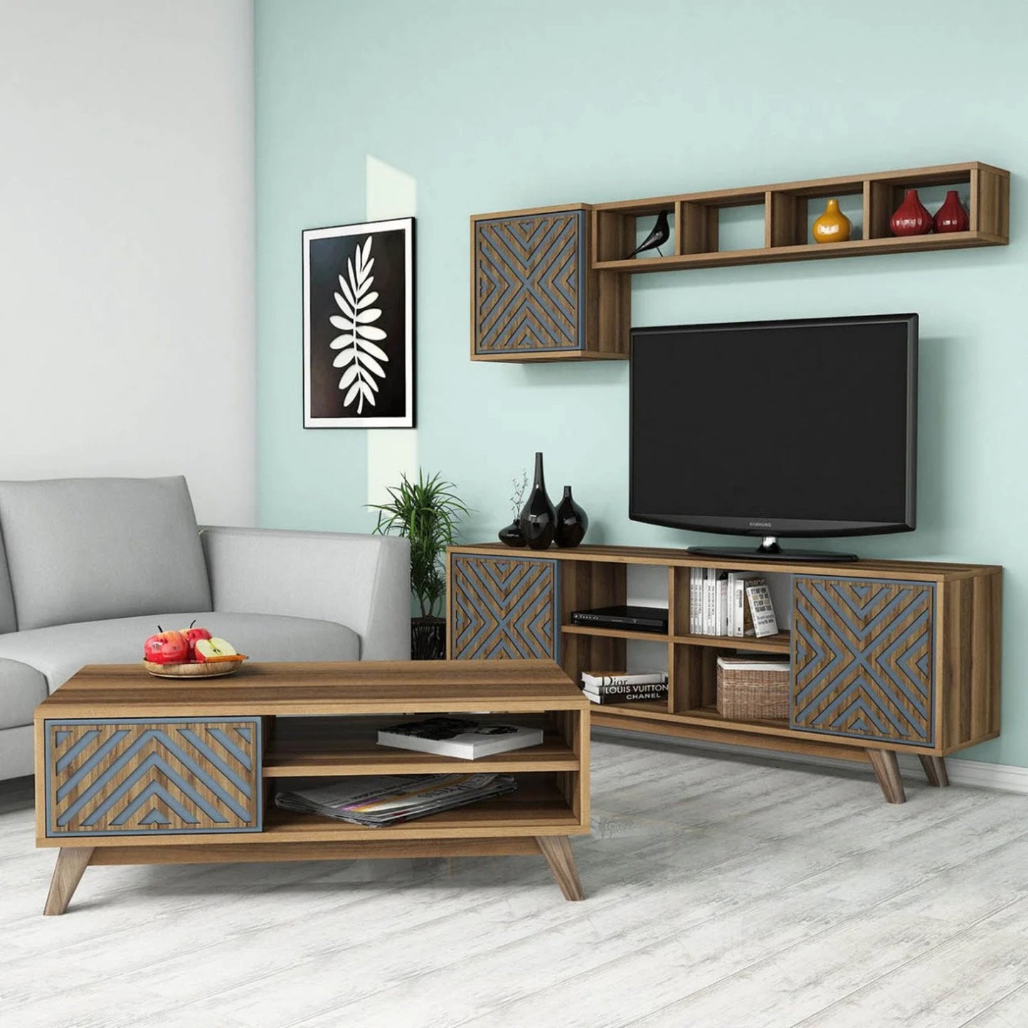 Η σύνθεση ΗΜ11853.02 θα αλλάξει την όψη στο σαλόνι σας και θα σας προσφέρει την αναβάθμιση που θέλετε. Αποτελείται από έναν συνδυασμό επίπλων για την τηλεόρασή σας με μονάδα δαπέδου, επιτοίχιο ράφι και επιτοίχιο ντουλάπι, και ένα τραπεζάκι σαλονιού. Χαρακτηριστικό όλης της σύνθεσης είναι οι πολλοί χώροι αποθήκευσης και τοποθέτησης αντικειμένων. Όλη η σύνθεση είναι της ίδιας σειράς και τα κυρίαρχα χρώματα είναι το ΚΑΡΥΔΙ και το ΜΠΛΕ.