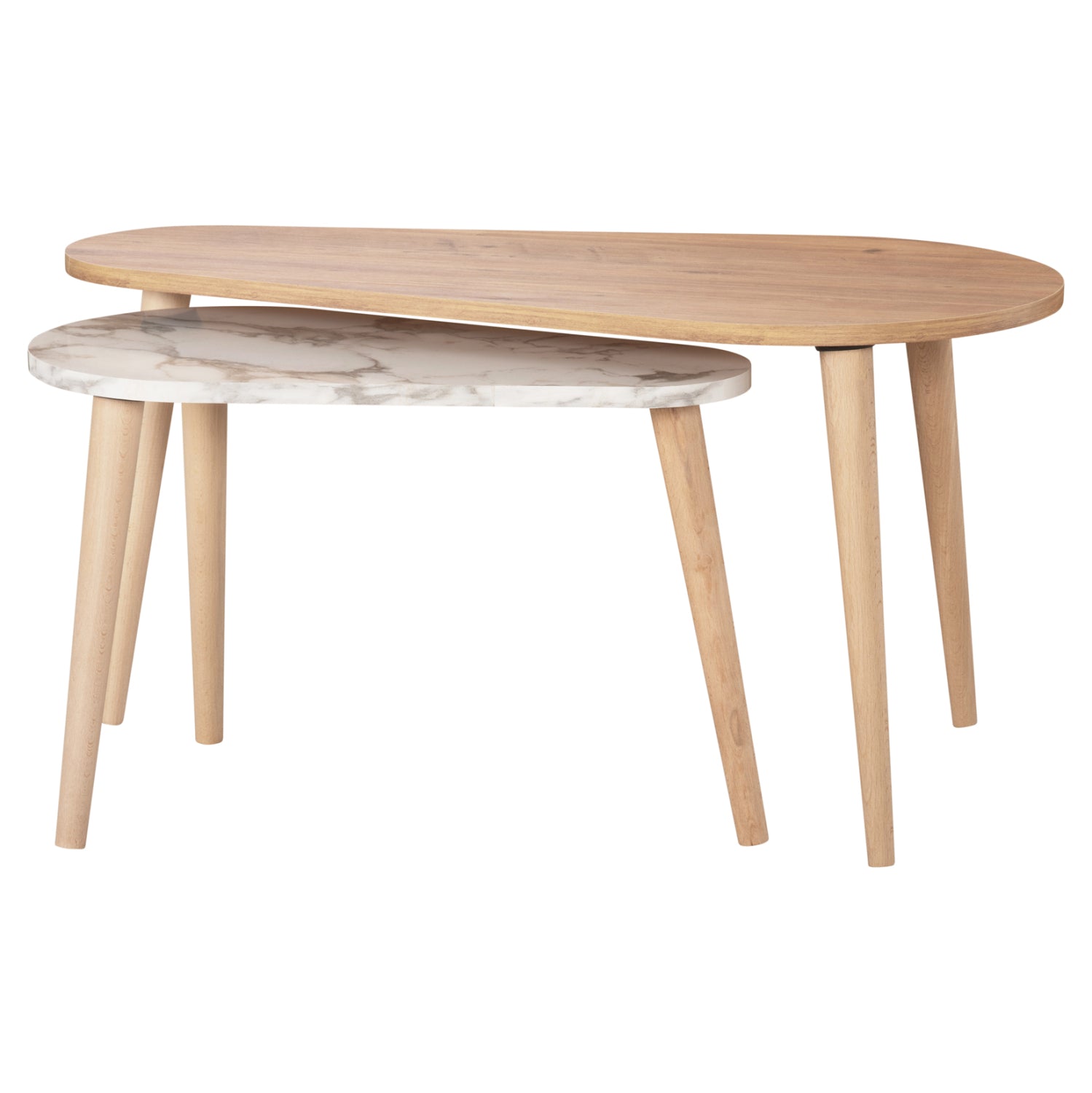 Το καινούργιο σετ 2τμχ οβάλ τραπεζιών για το σαλόνι APRILIA θα ικανοποιήσει και θα εξυπηρετήσει κάθε σας ανάγκη στο χώρο του σαλονιού. Πρόκειται για 2 τρίποδα τραπέζια με επιφάνεια από μελαμίνη 18mm σε χρωματισμό ΦΥΣΙΚΟ ξύλου το ένα και όψη ΛΕΥΚΟΥ ΜΑΡΜΑΡΟΥ το μικρότερο, ενώ τα πόδια είναι ξύλινα σε ΦΥΣΙΚΟ χρώμα ξύλου.