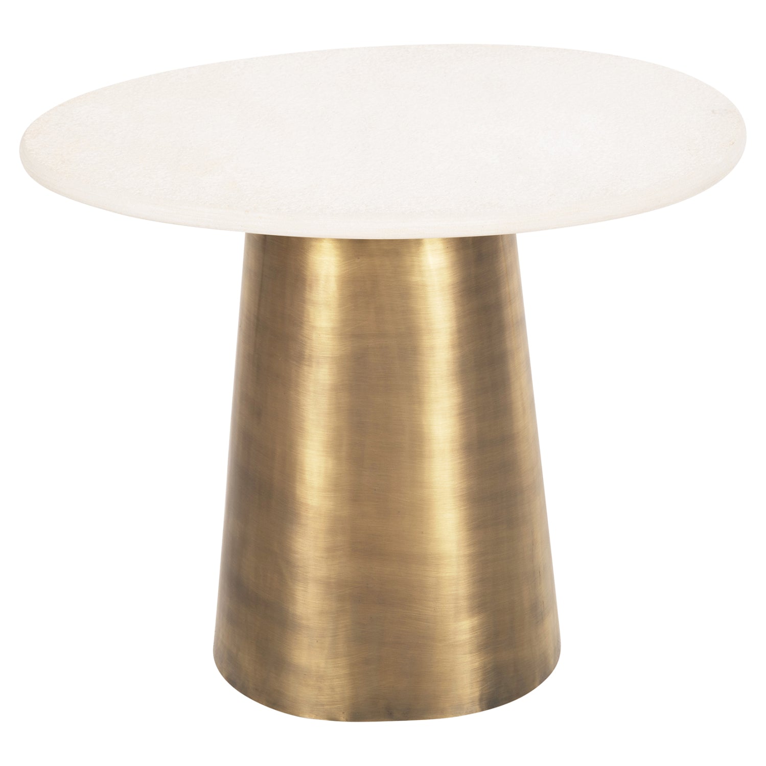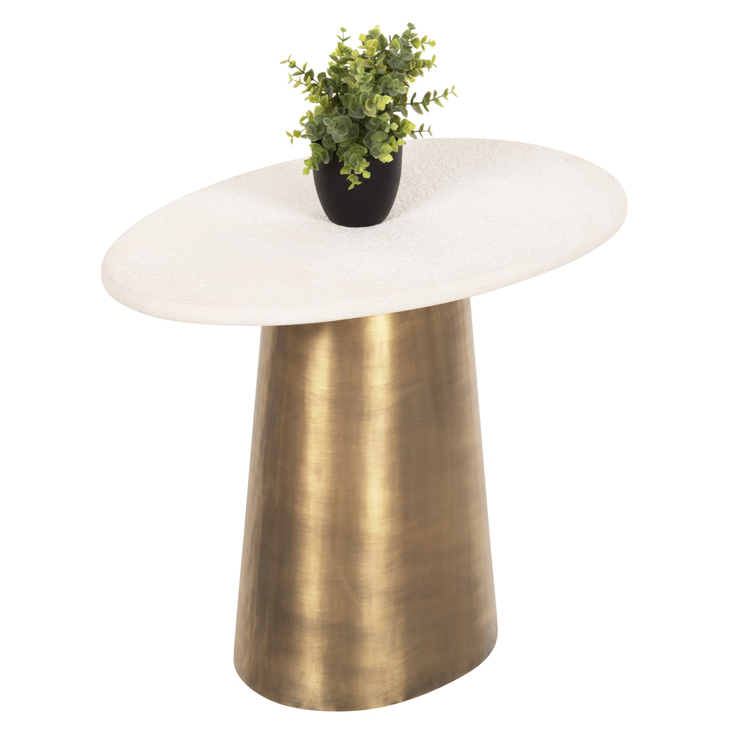 Το βοηθητικό τραπέζι FODEN για το σαλόνι είναι σε σχήμα ακανόνιστου οβάλ με μεταλλική οβάλ βάση σε ΧΡΥΣΟ χρώμα. Επάνω σε αυτή την βάση είναι μονταρισμένη η σαγρέ μαρμάρινη επιφάνεια σε ΛΕΥΚΟ χρώμα, που δίνει στο τραπέζι την αίσθηση της πολυτέλειας και της στιβαρότητας. Ιδανικό τόσο για το σπίτι, όσο και για επαγγελματικούς χώρους.
