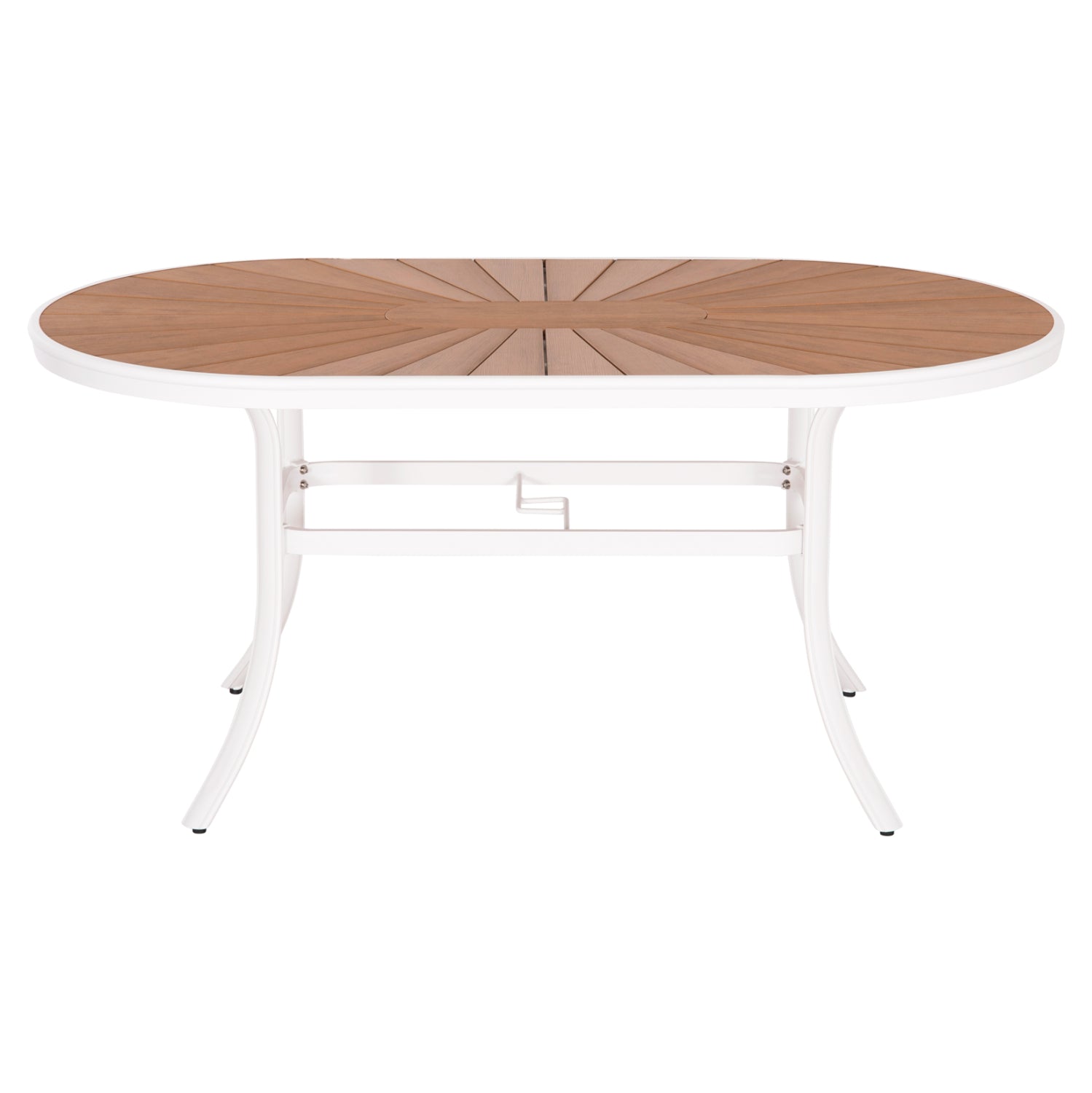Το TELAMO είναι ένα οβάλ τραπέζι για εξωτερικούς χώρους με σκελετό αλουμινίου σε ΛΕΥΚΟ χρώμα. Η επιφάνεια είναι από πλάκες polywood σε ΦΥΣΙΚΟ χρώμα ξύλου. Πρόκειται για ένα τραπέζι σε κανονική διάσταση, που μπορεί να εξυπηρετήσει 6 τουλάχιστον άτομα.