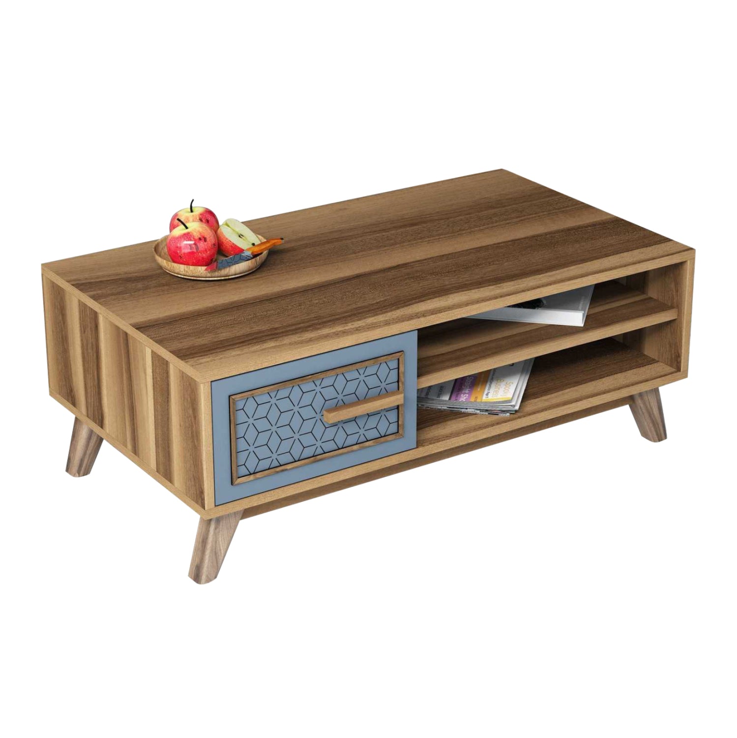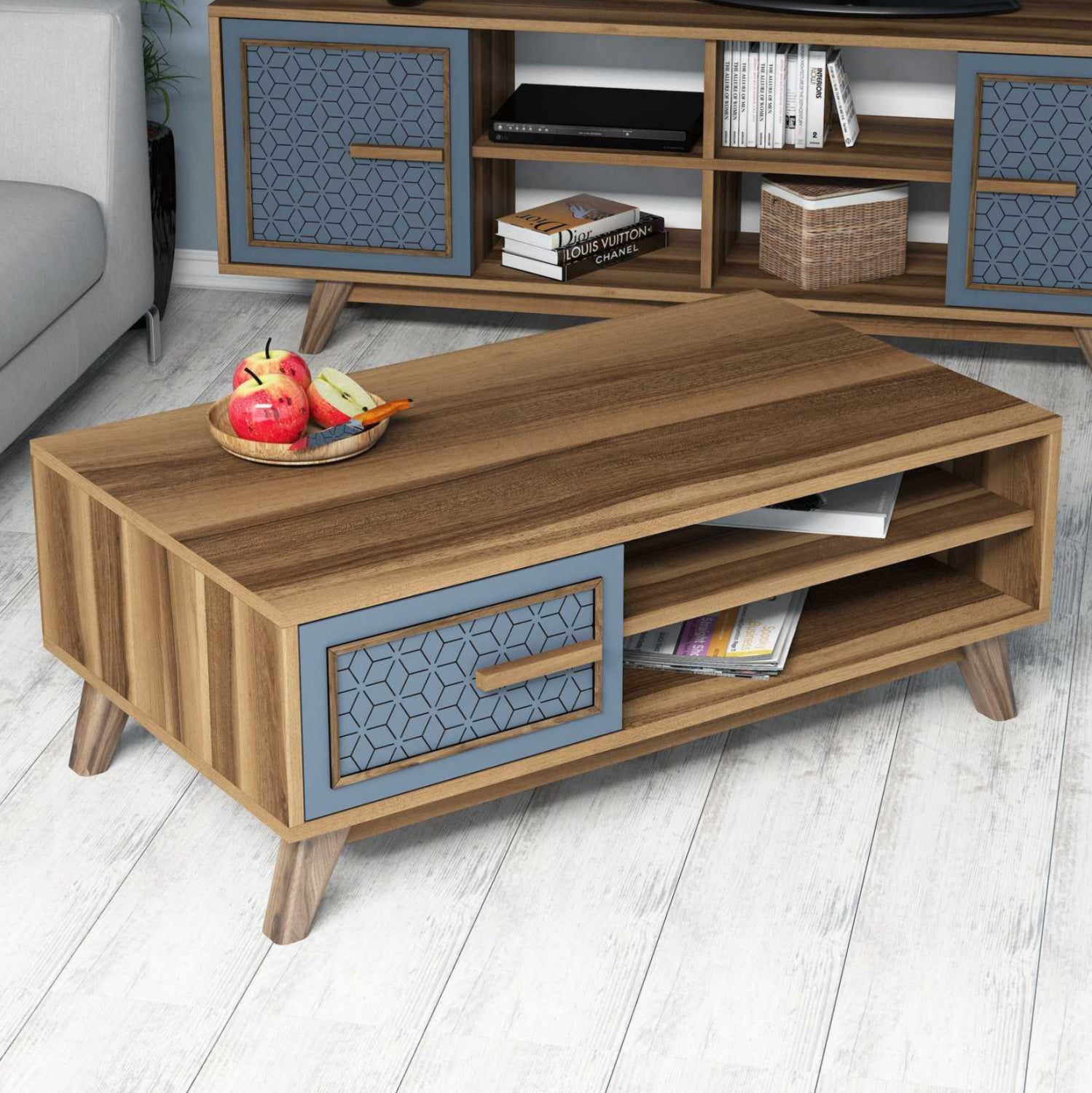 ΗΜ9497.02 τραπεζάκι σαλονιού----- Το τραπεζάκι αυτό είναι ένα πανέμορφο έπιπλο σε χρώμα καρυδί. Το πρακτικό του design θα αλλάξει την εικόνα του σαλονιού ή του καθιστικού σας προς το καλύτερο. Πρόκειται για μια κατασκευή με μια ικανοποιητικού μεγέθους επάνω επιφάνεια. Από κάτω υπάρχουν δύο ράφια και ένας ακόμα αποθηκευτικός χώρος με πορτάκι σε ΜΠΛΕ χρώμα. Η κομψότητα, η ποιότητα και το minimal πρακτικό design, είναι κάποια χαρακτηριστικά από το τραπέζι σαλονιού, που έχει φτιαχτεί για εσένα.
