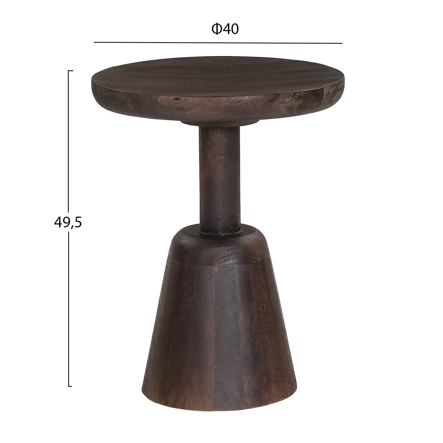 Το στρογγυλό τραπέζι σαλονιού CRABB που είναι εξολοκλήρου κατασκευασμένο από μασίφ ξύλο mango σε ΣΚΟΥΡΟ ΚΑΦΕ χρώμα μοιάζει με σκαμπό, χάρη στο κωνικό σχήμα της βάσης που καταλήγει στην στρογγυλή επιφάνεια. Ένα τραπέζι που θα εντυπωσιάσει με το σχήμα και το χρώμα του, αφού είναι sand blasted, προσδίδοντας εικόνα παλαιότητας στο έπιπλο.