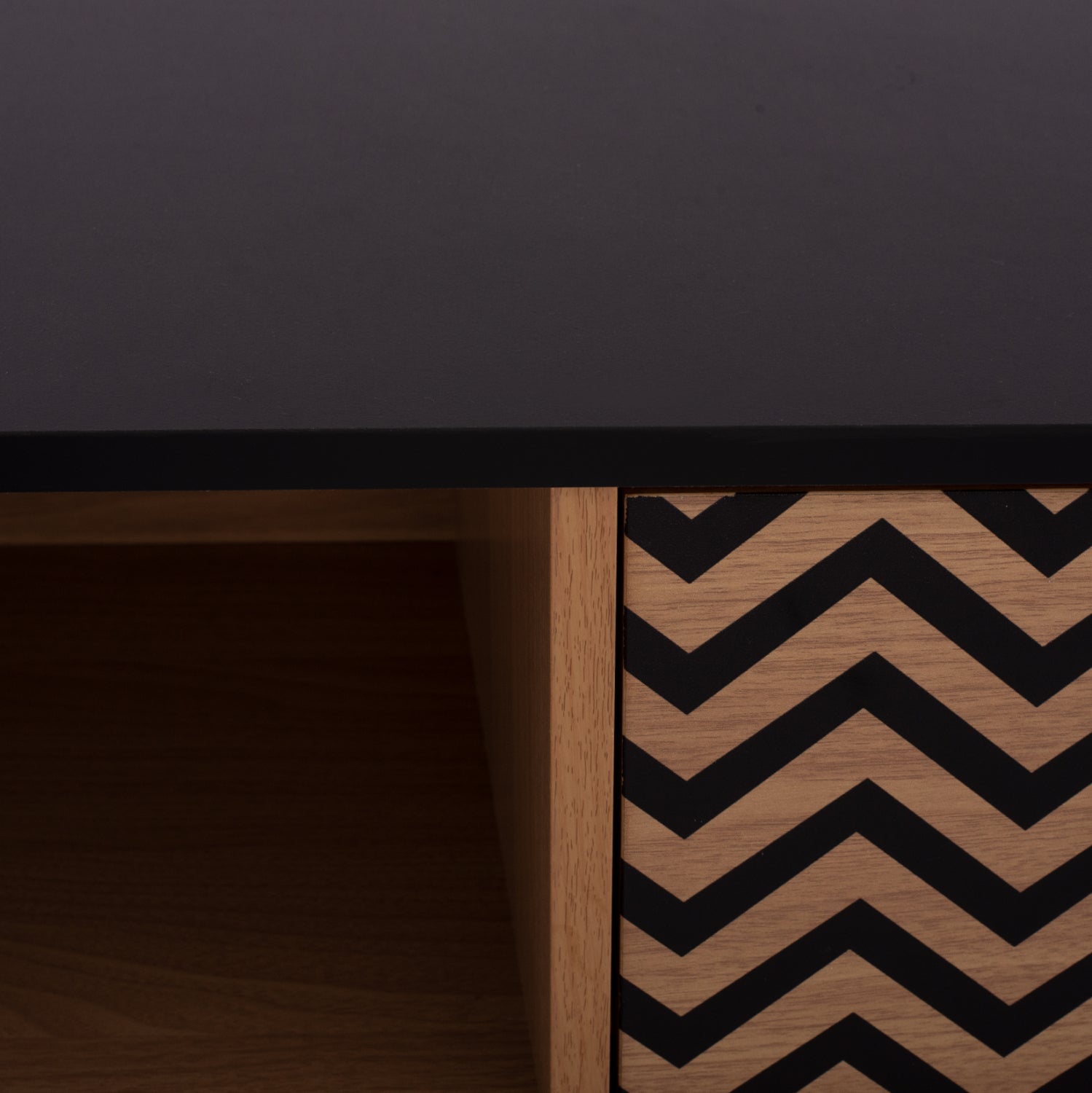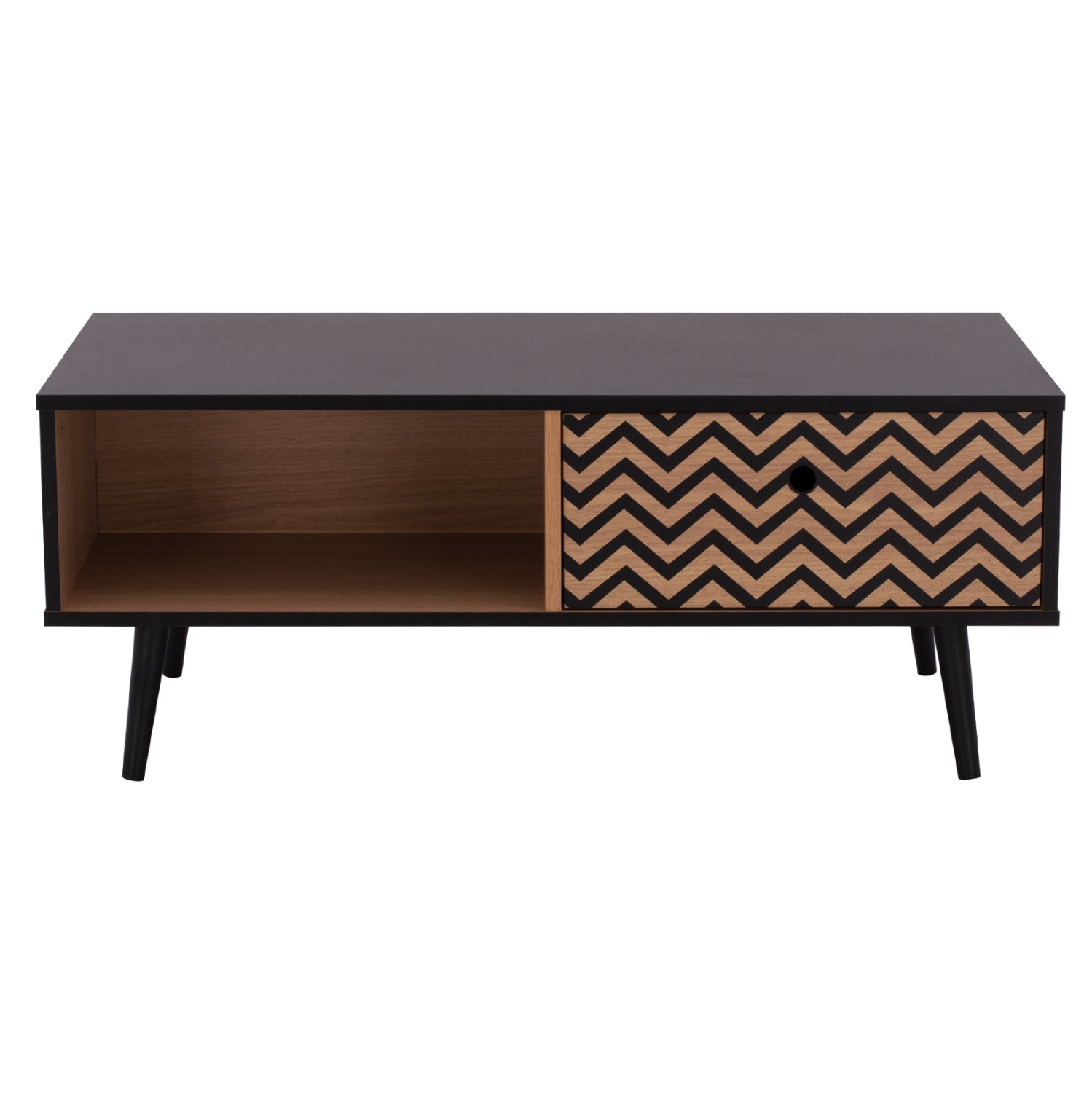 Μοντέρνο τραπεζάκι σαλονιού από τη σειρά CHARLEEN κατασκευασμένο από μελαμίνη σε φυσική απόχρωση, με μαύρες λεπτομέρειες.