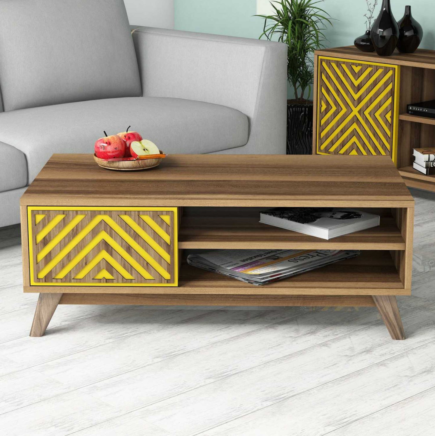 ΗΜ9502.04 τραπεζάκι σαλονιού----- Το τραπεζάκι αυτό είναι ένα πανέμορφο έπιπλο σε χρώμα καρυδί. Το πρακτικό του design θα αλλάξει την εικόνα του σαλονιού ή του καθιστικού σας προς το καλύτερο. Πρόκειται για μια κατασκευή με μια ικανοποιητικού μεγέθους επάνω επιφάνεια. Από κάτω υπάρχουν δύο ράφια και ένα ντουλαπάκι με ΚΙΤΡΙΝΟ πορτάκι. Η κομψότητα, η ποιότητα και το minimal πρακτικό design, είναι κάποια χαρακτηριστικά από το τραπέζι σαλονιού, που έχει φτιαχτεί για εσένα.