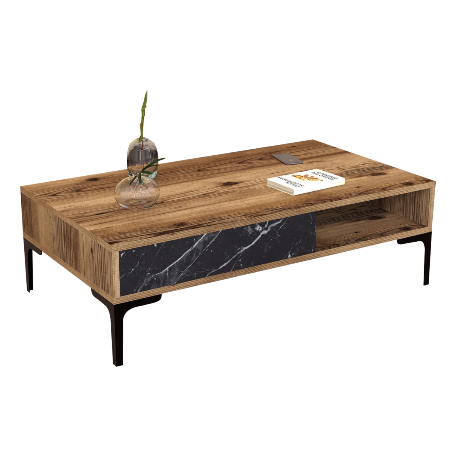 ΗΜ9503.04 τραπεζάκι σαλονιού----- Το τραπεζάκι αυτό είναι ένα όμορφο έπιπλο σε χρώμα καρυδί με πλαϊνό σε ΟΨΗ ΜΑΥΡΟΥ ΜΑΡΜΑΡΟΥ. Το πρακτικό του design θα αλλάξει την εικόνα του σαλονιού ή του καθιστικού σας προς το καλύτερο. Πρόκειται για μια κατασκευή με μια ικανοποιητικού μεγέθους επάνω επιφάνεια. Από κάτω υπάρχει ανοιχτός χώρος τοποθέτησης αντικειμένων κατά το ήμισυ. Η κομψότητα, η ποιότητα και το minimal πρακτικό design χαρακτηρίζουν αυτό το τραπεζάκι, που έχει φτιαχτεί για εσένα.