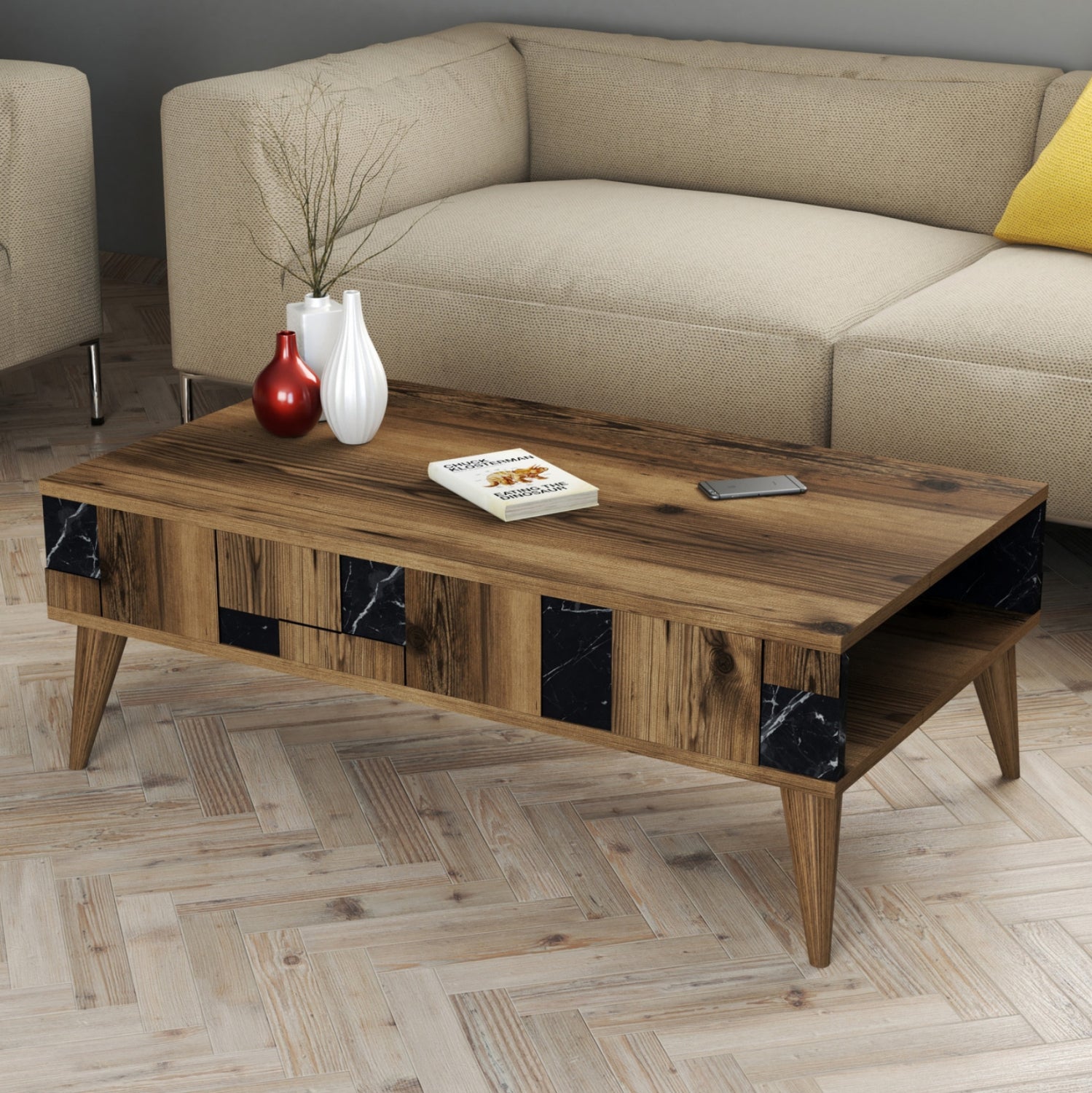 ΗΜ9504.02 τραπεζάκι σαλονιού----- Το τραπεζάκι αυτό είναι ένα όμορφο έπιπλο σε χρώμα καρυδί και πλαϊνά με λεπτομέρειες ΣΕ ΟΨΗ ΜΑΥΡΟΥ ΜΑΡΜΑΡΟΥ. Το πρακτικό του design θα αλλάξει την εικόνα του σαλονιού ή του καθιστικού σας προς το καλύτερο. Πρόκειται για μια κατασκευή με μια ικανοποιητικού μεγέθους επάνω επιφάνεια. Από κάτω υπάρχει διαμπερής χώρος τοποθέτησης αντικειμένων με πρόσβαση μόνο από τις δύο πλευρές. Η κομψότητα, η ποιότητα και το minimal πρακτικό design χαρακτηρίζουν αυτό το τραπεζάκι, που έχει φτιαχτεί για εσένα.