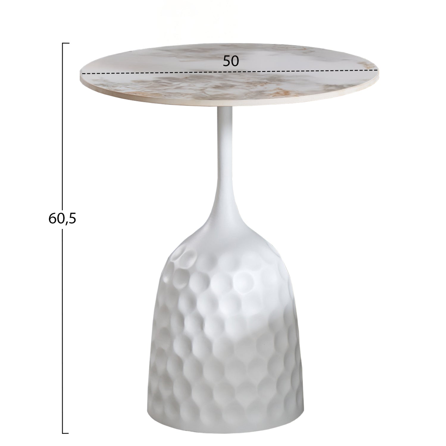 Το LONGSTEM είναι ένα εντυπωσιακό τραπέζι που θα κοσμήσει το σαλόνι σας. Η ψηλή κυλινδρική του βάση είναι μεταλλική με διάστικτη τεχνοτροπία σε ΛΕΥΚΟ χρώμα, ενώ η στρογγυλή επιφάνεια είναι κατασκευασμένη από γυαλιστερό sintered stone σε χρωματικό σχήμα CALACATA GOLD. Ιδανικό τόσο για το σπίτι, όσο και για επαγγελματικούς χώρους.