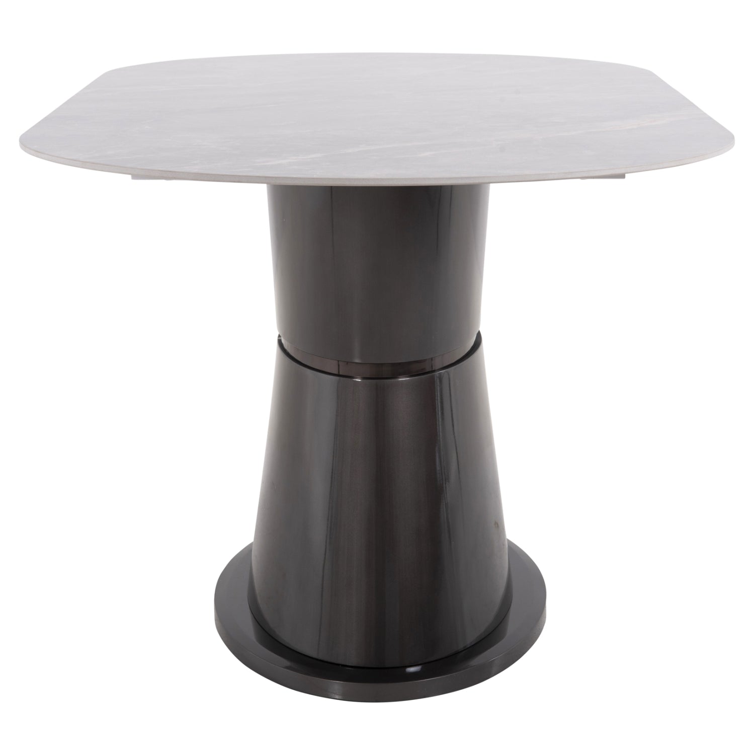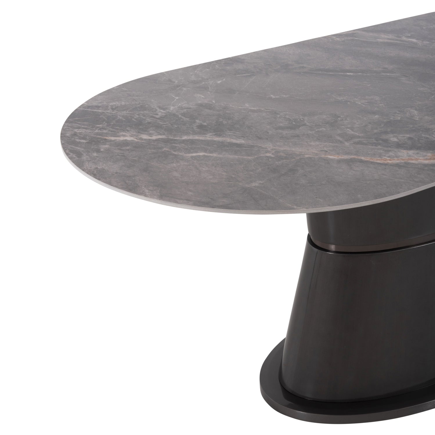 Το ΒΕΝΤ είναι ένα μεγάλο τραπέζι τραπεζαρίας με μακρύ οβάλ σχήμα επιφανείας, η οποία στηρίζεται σε μια πανέμορφη οβάλ βάση. Η επιφάνεια είναι κεραμική υψηλής ποιότητας από σχιστόλιθο σε χρωματισμό ΓΚΡΙ ΜΑΡΜΑΡΟΥ, ενώ η βάση είναι σε ΑΝΘΡΑΚΙ χρώμα από MDF. Το συγκεκριμένο τραπέζι θα αποτελέσει σημείο αναφοράς σε οποιοδήποτε χώρο τραπεζαρίας ή εστίασης κι αν τοποθετηθεί.
