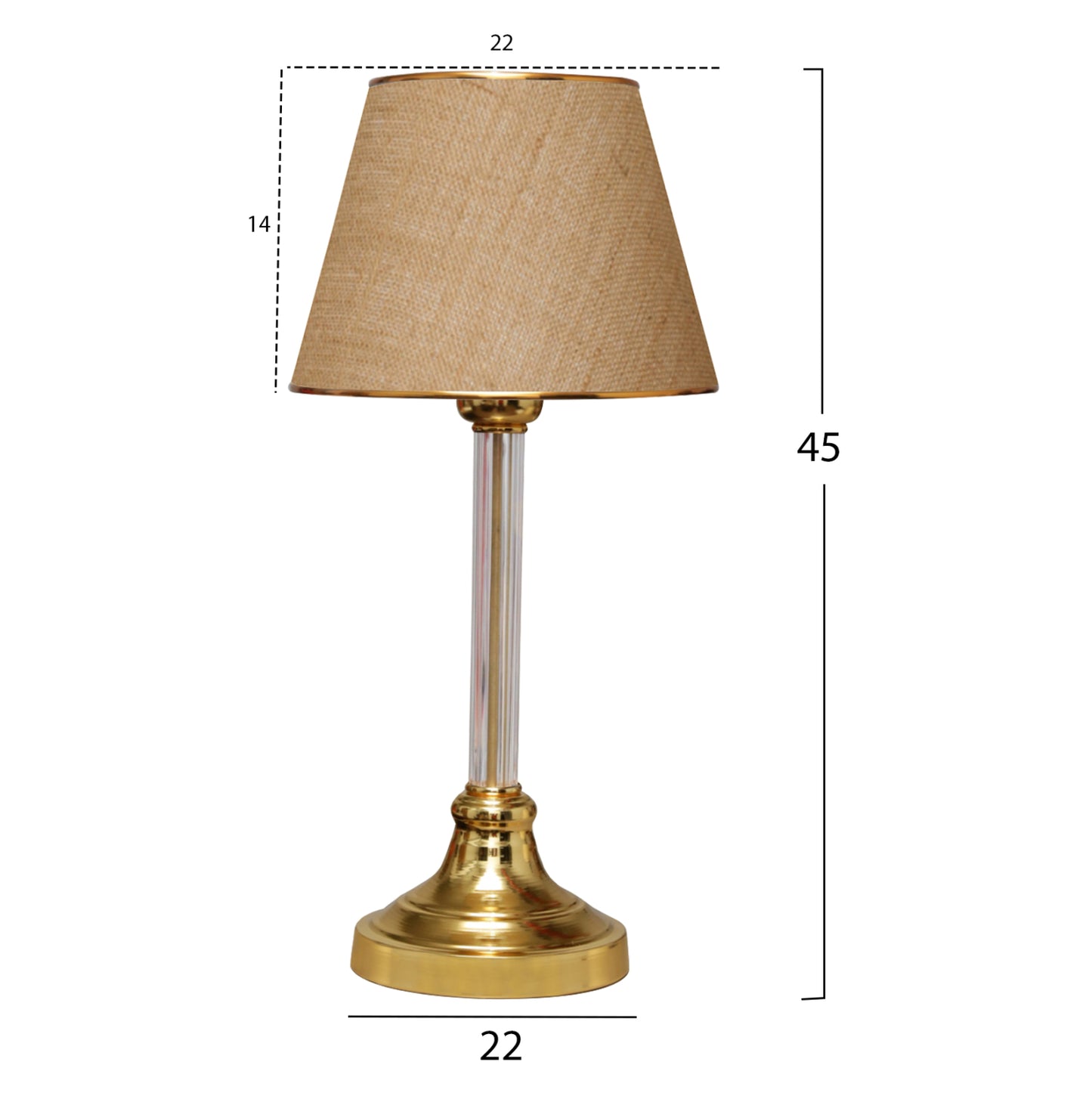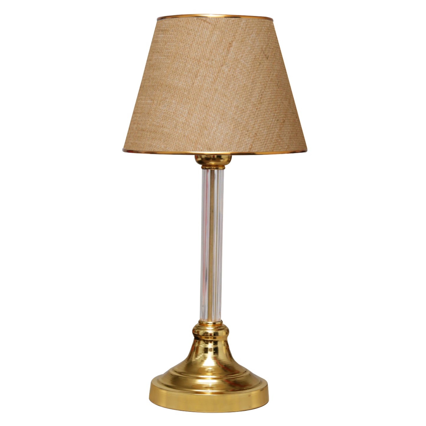 Επιτραπέζιο διακοσμητικό φωτιστικό με μονή κολώνα. Η βάση του φωτιστικού έχει καμπανοειδές σχήμα σε χρυσό γυαλιστερό χρώμα ενώ η κολώνα είναι επίσης σε χρυσό χρώμα και βρίσκεται μέσα σε πλαστικό διαφανή σωλήνα. Το «καπέλο» έχει τραπεζοειδές κυκλικό σχήμα στο χρώμα της άμμου και έχει χρυσούς δακτυλίους στις άκρες του. Το φως διαχέεται στον χώρο ευχάριστα και η αντανάκλασή του πάνω στην διάφανη κολωνίτσα του φωτιστικού αλλά και στην γυαλιστερή επιφάνεια της βάσης, παιχνιδίζει ευχάριστα στο μάτι. Αυτού του είδους τα φωτιστικά δεν προορίζονται για φωτιστικά διαβάσματος και αυτό πρέπει πάντα να λαμβάνεται υπόψη κατά την επιλογή τους. Είναι καθαρά διακοσμητικά και το ταίριασμά τους με τον περιβάλλοντα χώρο θα πρέπει να είναι αρμονικό. Αυτό το φωτιστικό είναι κομψό και βολικό σε διαστάσεις παρέχοντας αμέτρητες δυνατότητες «δεσίματος» με την υπόλοιπη διακόσμησή σας. Είναι ένα μικρό έργο τέχνης.