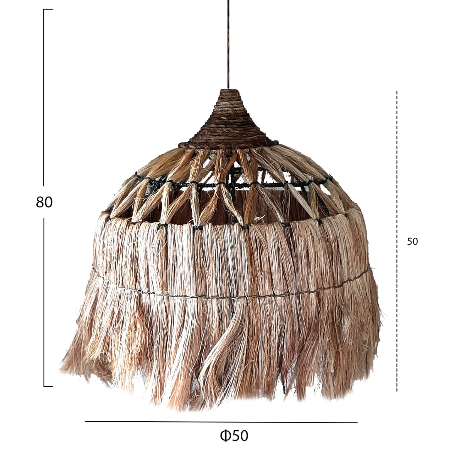 Hm7760- Kρεμαστό φωτιστικό---- Αν επιθυμείτε να διακοσμήσετε το χώρο σας με ένα φωτιστικό σε boho στυλ, αυτό είναι μια χαρακτηριστική επιλογή. Είναι ένα μονόφωτο φωτιστικό με «καπέλο» σε σχήμα καμπάνας φτιαγμένο από ίνες κάνναβης Μανίλας σε φυσικό χρώμα. Το ιδιαίτερο χαρακτηριστικό αυτού του φωτιστικού είναι ότι στο επάνω μέρος του καπέλου οι ίνες είναι πλεγμένες με χιαστί τρόπο δίνοντας μια άλλη αισθητική στο φωτιστικό.