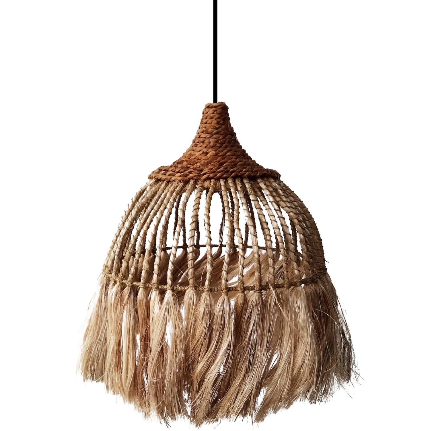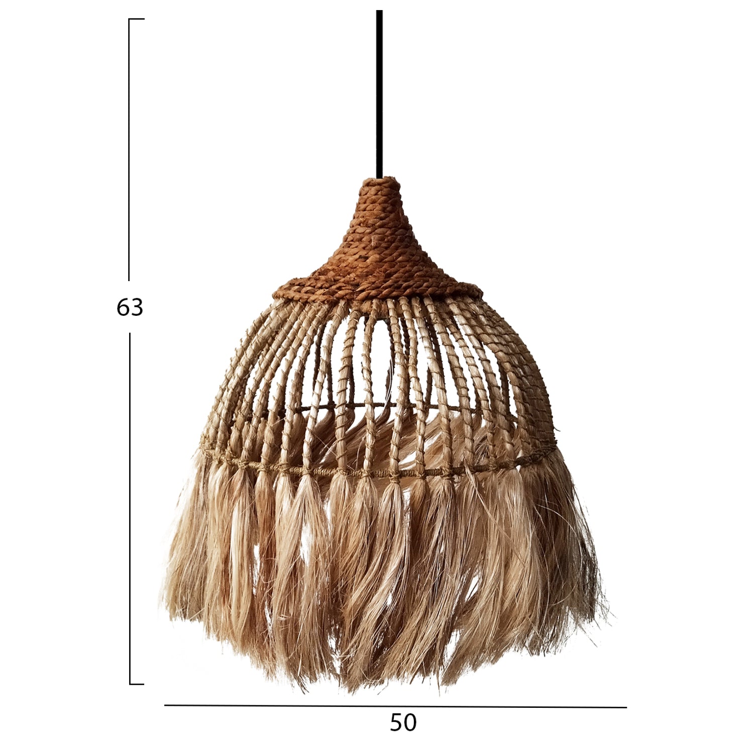 Hm7752- Kρεμαστό φωτιστικό---- Αν επιθυμείτε να διακοσμήσετε το χώρο σας με ένα φωτιστικό σε boho στυλ, αυτό είναι η πιο σωστή επιλογή. Είναι ένα μονόφωτο φωτιστικό για επαγγελματική χρήση, με «καπέλο» σε σχήμα καμπάνας φτιαγμένο από σκοινί, υψηλής ποιότητας και αντοχής στο χρόνο. Το ιδιαίτερο χαρακτηριστικό, όμως, αυτού του φωτιστικού είναι ότι το «καπέλο» καταλήγει σε κρόσια, επιτείνοντας ακόμα περισσότερο το boho στυλ.