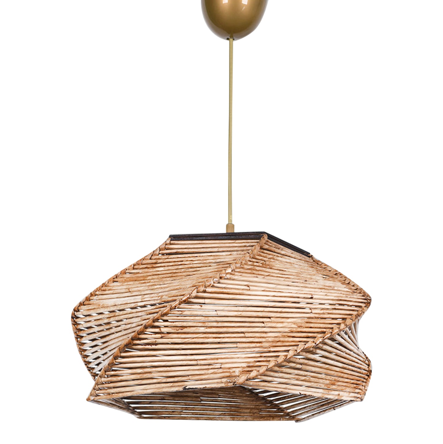 Μοντέρνο κρεμαστό φωτιστικό οροφής, κατασκευασμένο από ξύλινο σκελετό και επενδυμένο από bamboo υλικό σε φυσική απόχρωση με μαύρες λεπτομέρειες.