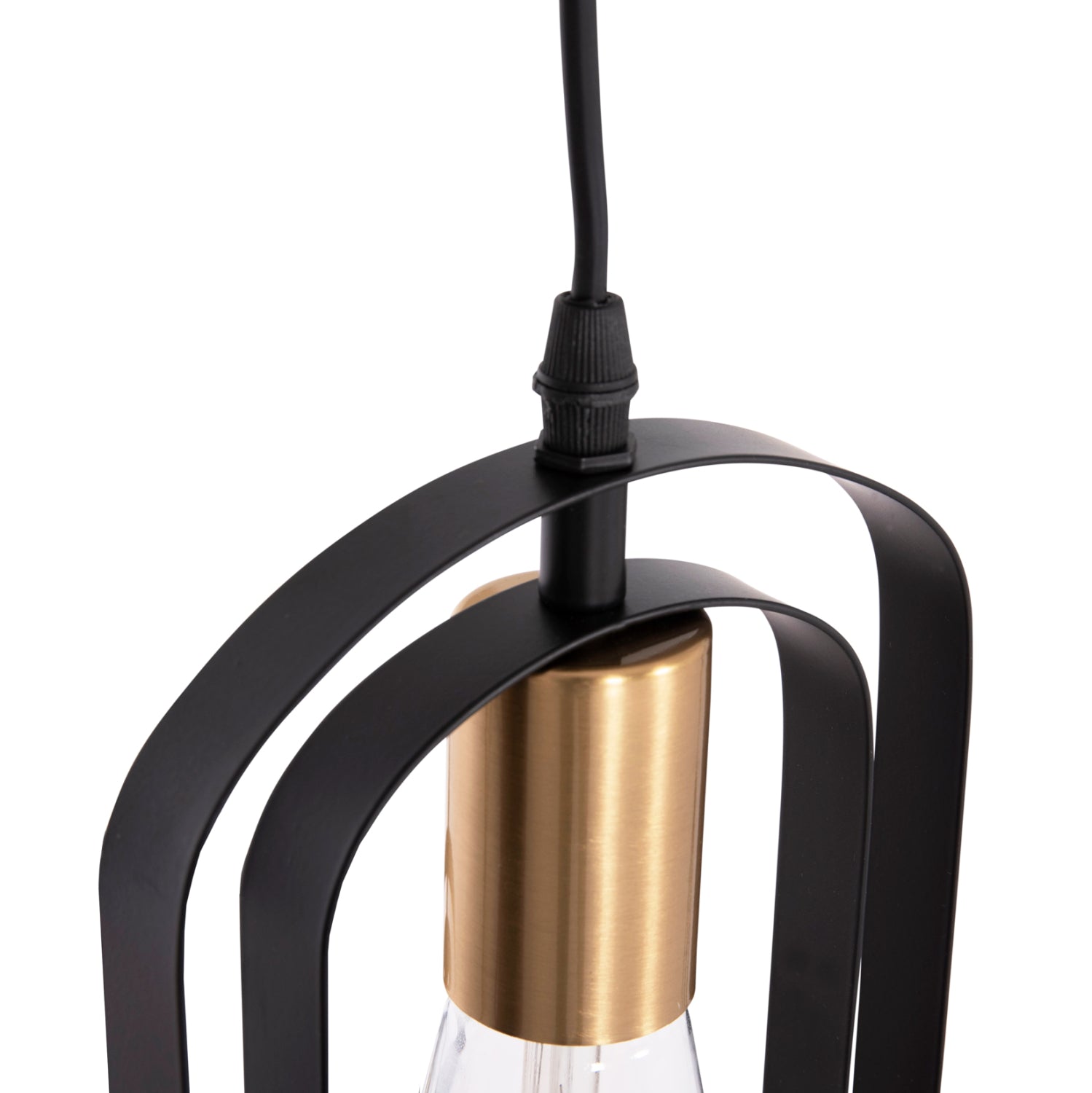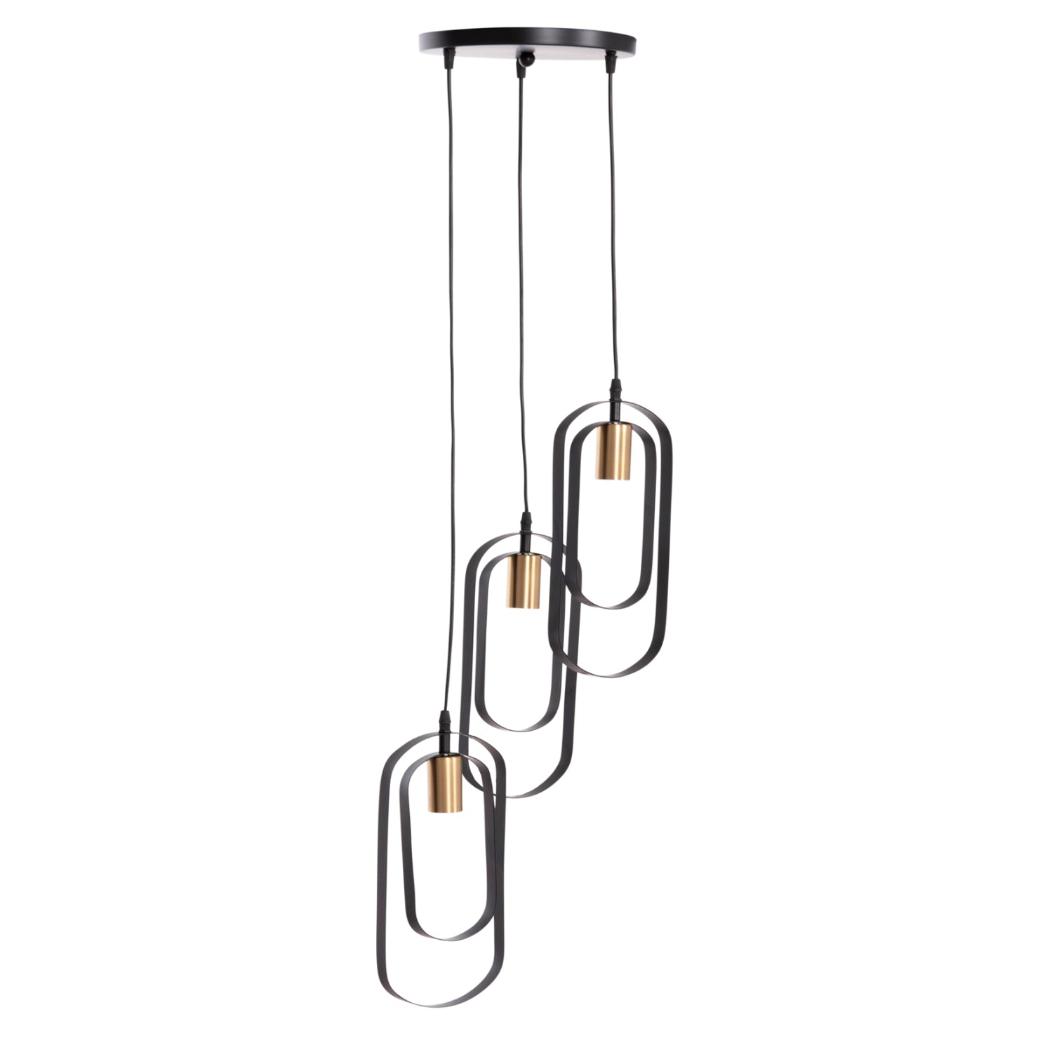 Το κρεμαστό φωτιστικό οροφής BIUT είναι ένα τρίφωτο κρεμαστό σε διαφορετικά ύψη με μαύρη στρογγυλή βάση και μαύρα καλώδια κρέμασης. Οι λάμπες τοποθετούνται σε ντουί χρυσού χρώματος ενώ αυτό που τραβάει τα βλέμματα είναι το minimal design των καπέλων με τα δύο μεταλλικά πλαίσια.
