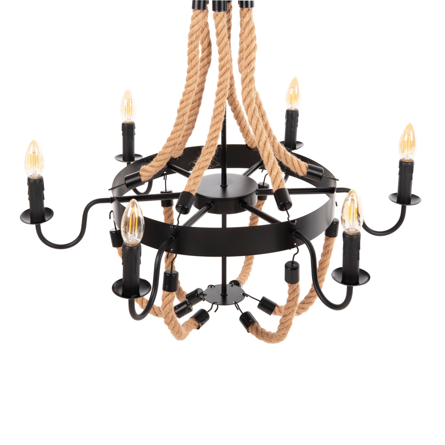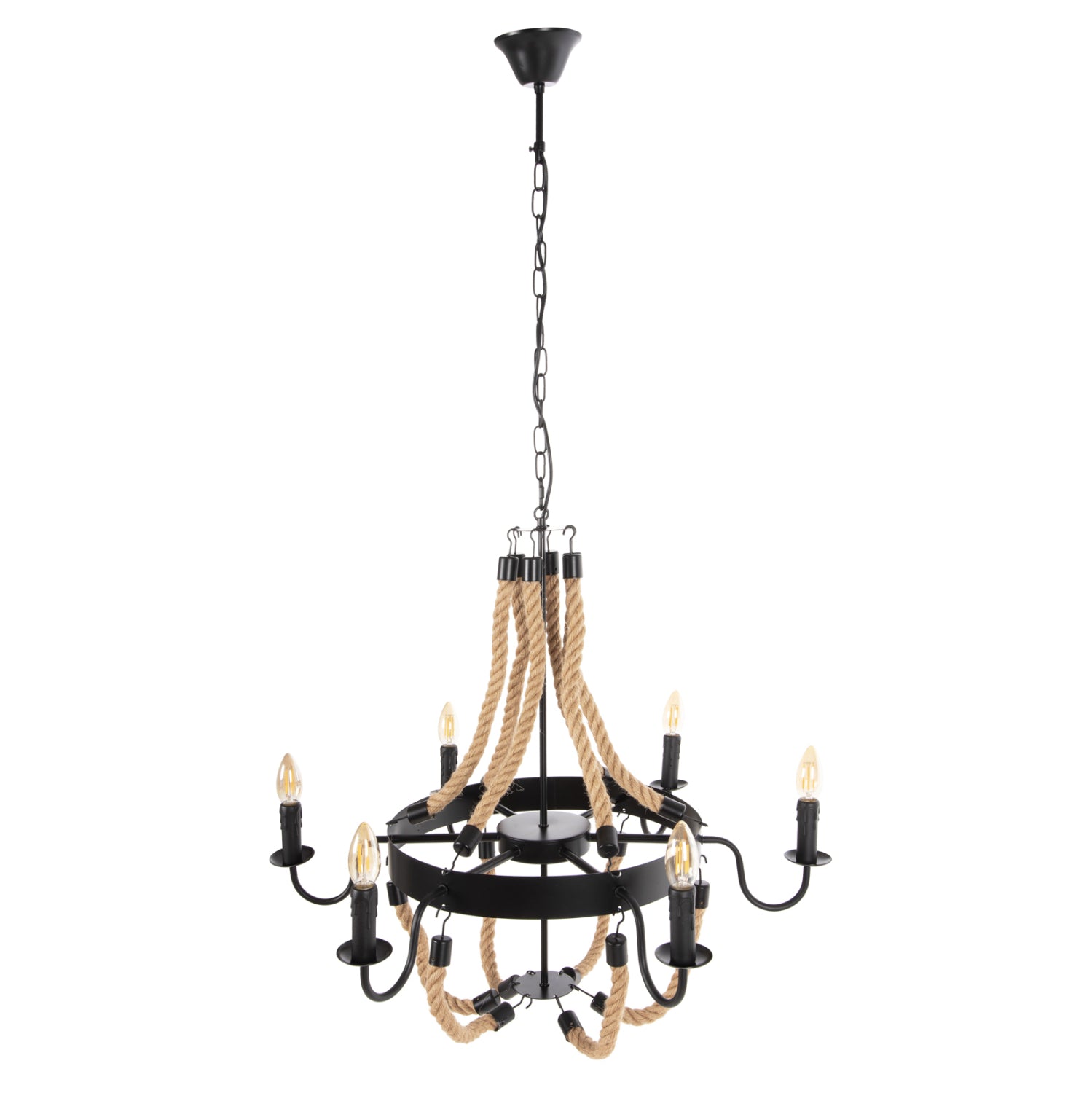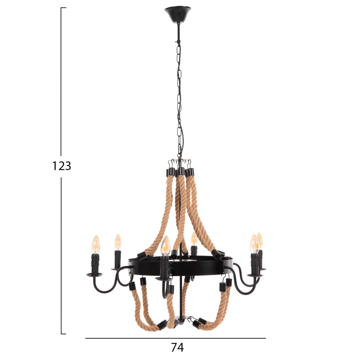 Το πολύφωτο ΗΜ4177 είναι μια ακόμα εντυπωσιακή προσθήκη στην γκάμα μας. Ο μαύρος μεταλλικός σκελετός του είναι κυκλικός και κρέμεται με αλυσίδα από την οροφή. Στον κυκλικό σκελετό είναι μονταρισμένα τα 6 φώτα σε μορφή κηροπηγίων, ενώ την εικόνα συμπληρώνουν τα σχοινιά που δίνουν την αίσθηση πολυελαίου στο φωτιστικό. Αυτό το πολύφωτο θα φωτίσει με άπλετο φως μεγάλους χώρους και θα εντυπωσιάσει με το όμορφο design του.