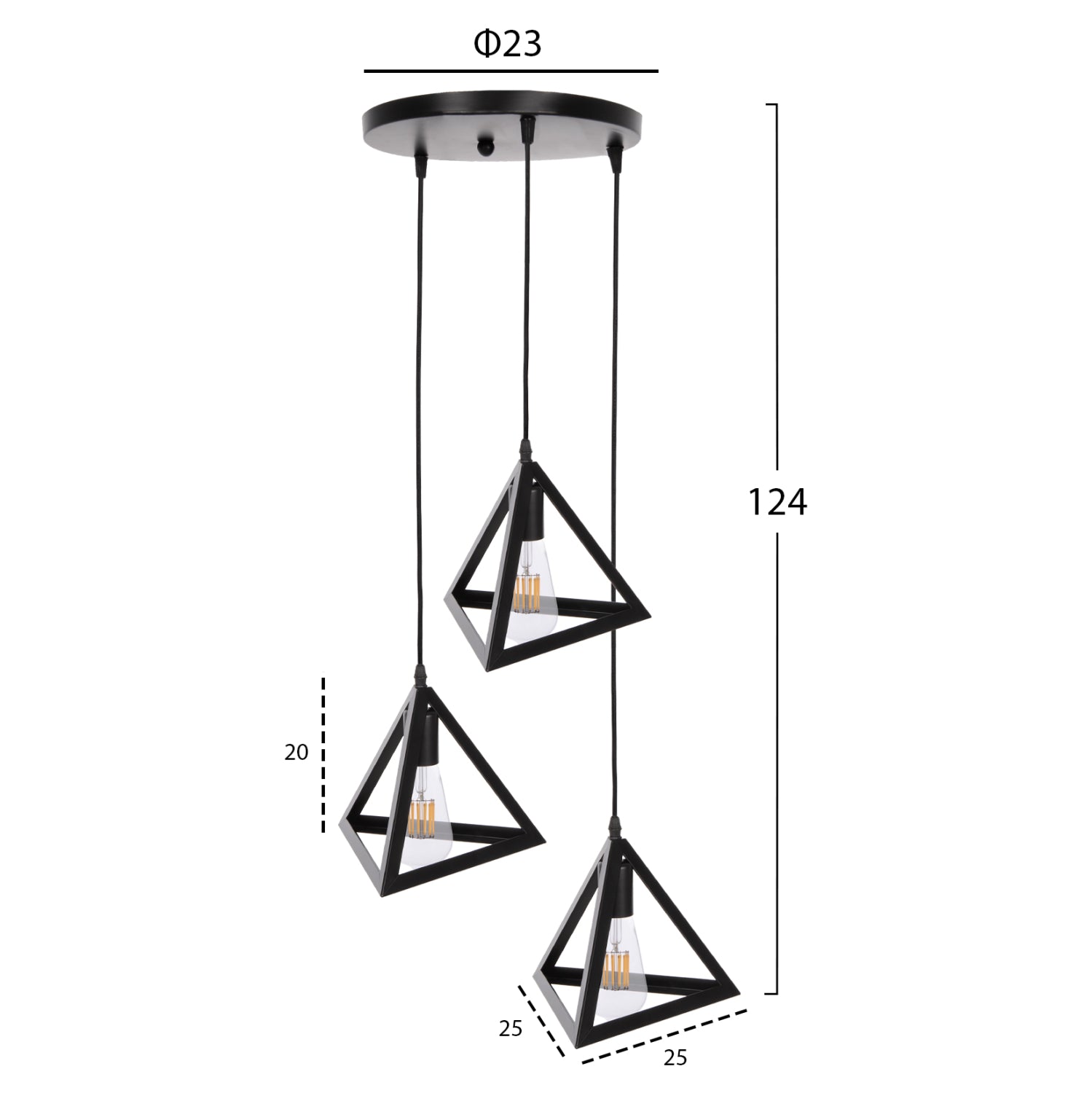 Ανακαλύψτε αυτό το νέο μας κρεμαστό 3-φωτο οροφής και ολοκληρώστε την διακόσμησή σας. Πρόκειται για ένα φωτιστικό με ΜΑΥΡΑ μεταλλικά καπέλα σε σχήμα πυραμίδας, και αποτελεί την τελευταία τάση στα φωτιστικά οροφής.