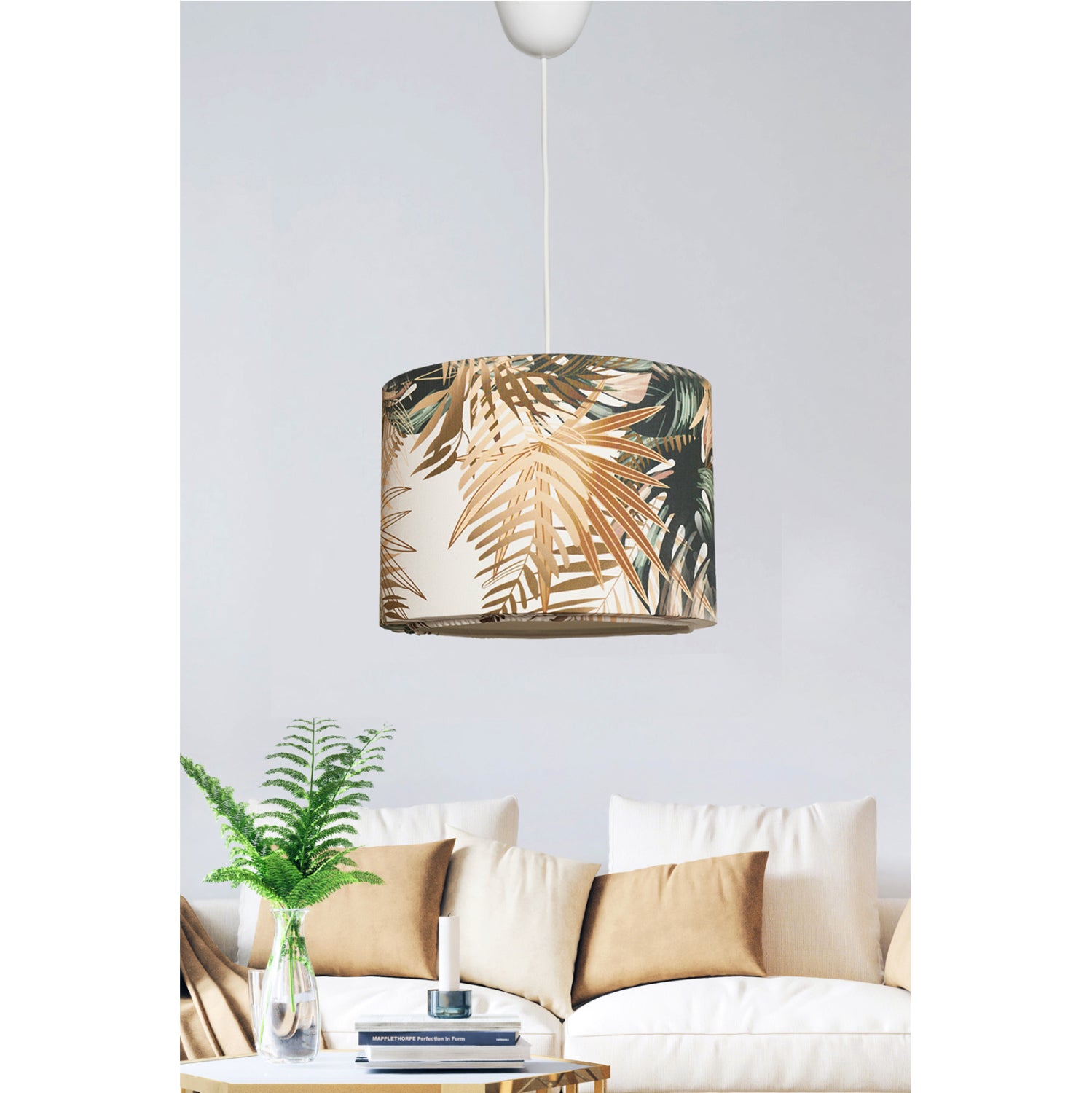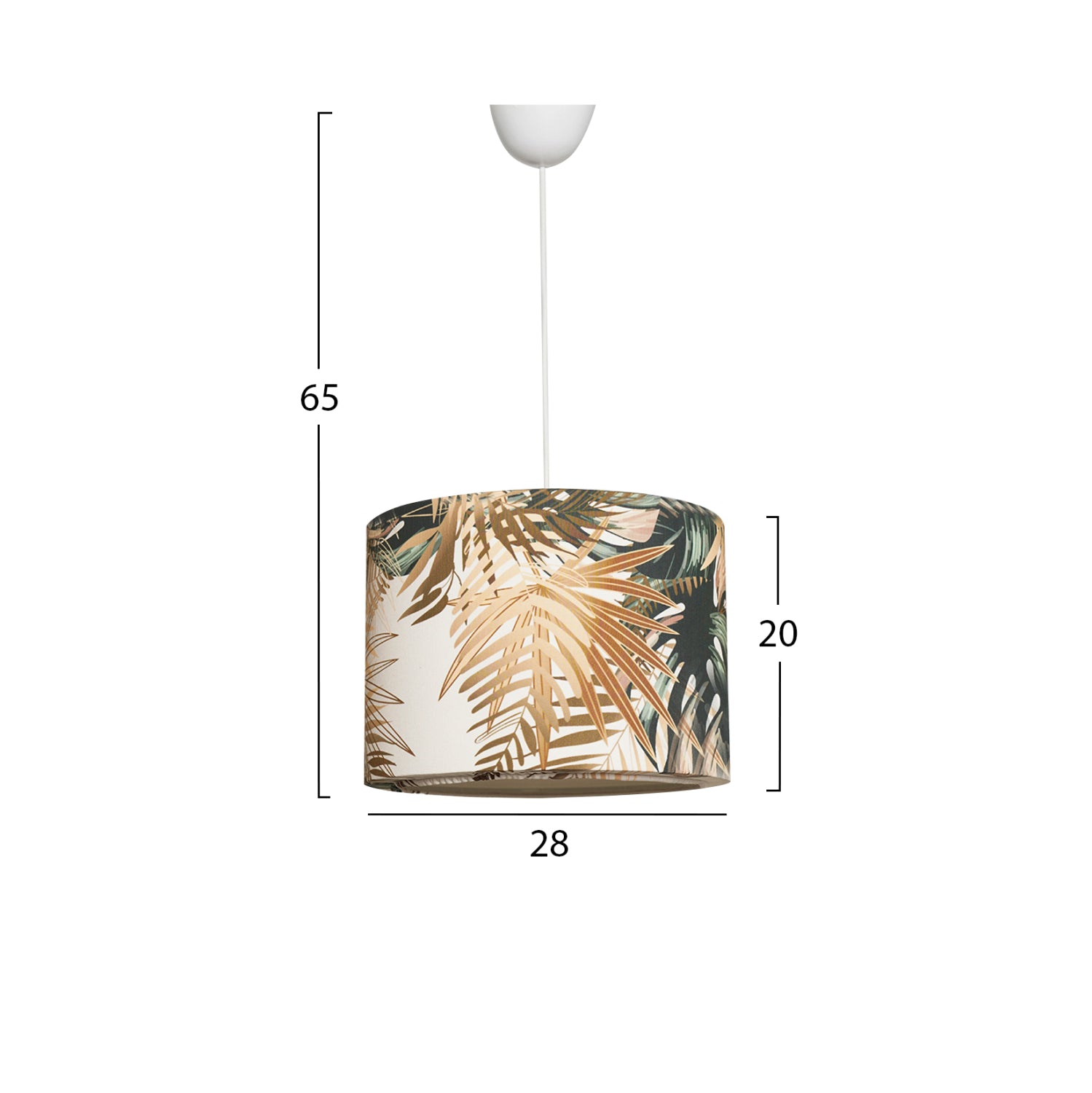 Μοντέρνο κρεμαστό φωτιστικό οροφής, κατασκευασμένο από μεταλλικό σκελετό και επενδυμένο από ύφασμα με tropical μοτίβο.
