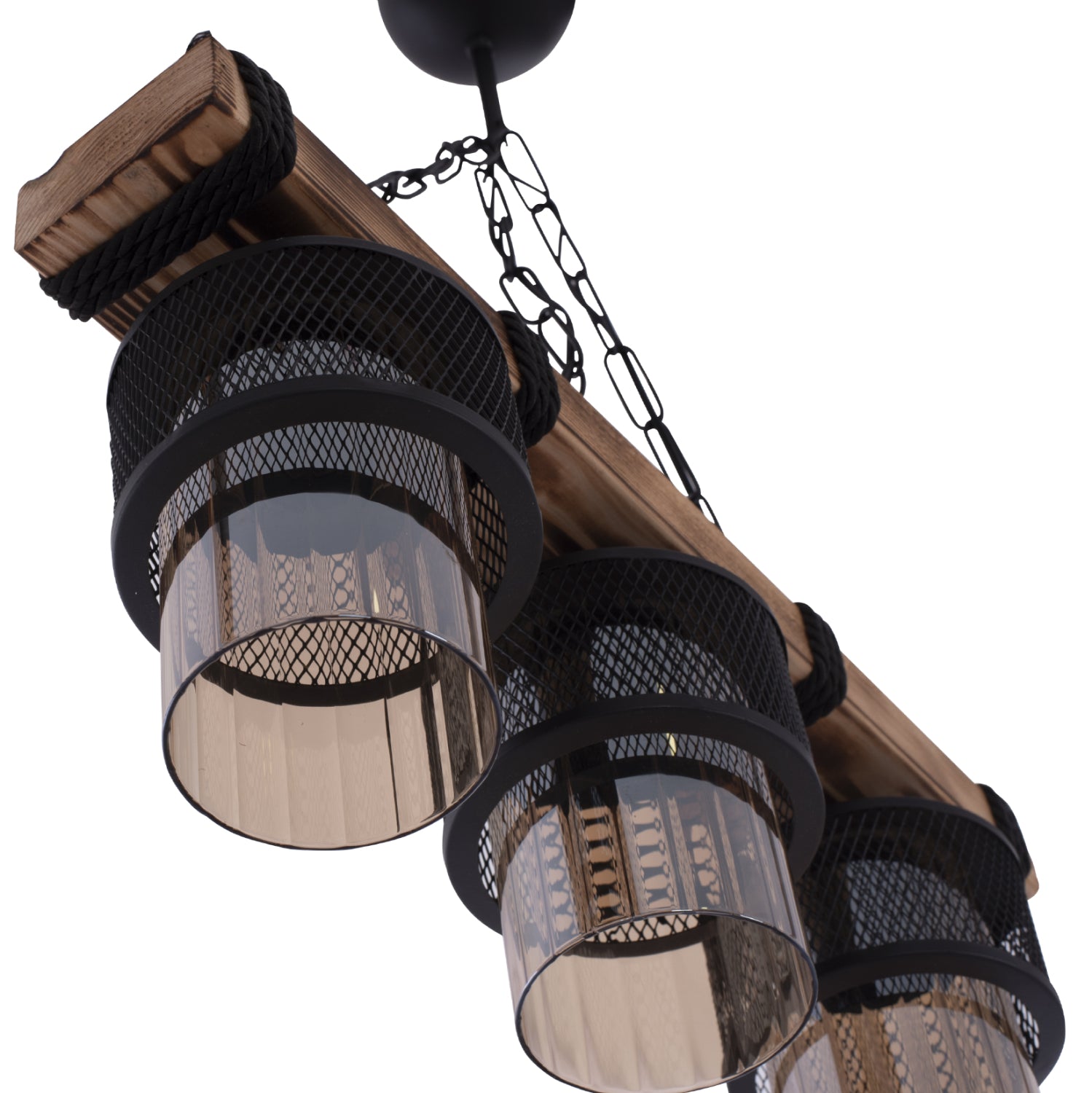 Πρόκειται για ένα όμορφο φωτιστικό με ξεχωριστή αισθητική και εμφάνιση. Το φυσικό χρώμα του ξύλου με την μαύρη μεταλλική αλυσίδα συνδυάζονται υπέροχα και αιχμαλωτίζουν τα βλέμματα, αλλά ταυτόχρονα απαιτούν και ιδιαίτερη διακοσμητική συνοχή για να αναδείξουν πλήρως τις αισθητικές αρετές του φωτιστικού. Τα υλικά των «καπέλων» επιτρέπουν στο φως να διαχέεται προς κάθε κατεύθυνση, καθιστώντας το φωτιστικό ιδανικό για πληθώρα χώρων.