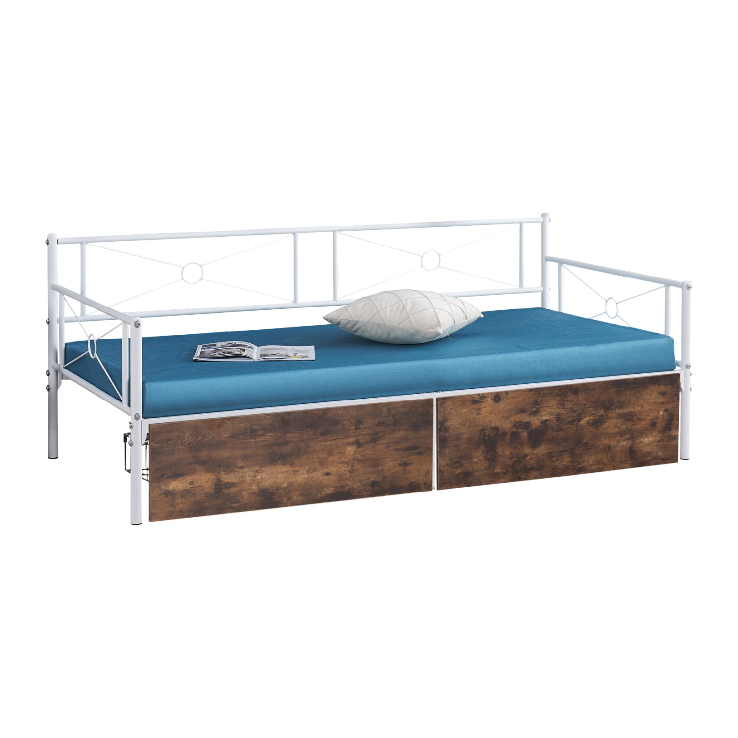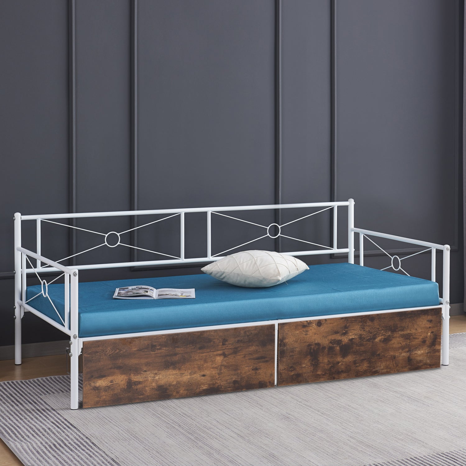Πρόκειται για μια αμιγώς μεταλλική κατασκευή σε ΛΕΥΚΟ χρώμα που μπορεί άνετα να σταθεί και να συνδυαστεί με πληθώρα διακοσμητικών μοτίβων σε κάθε χώρο. Η πλάτη είναι μεταλλική με συμμετρικά μεταλλικά σχέδια ενώ και τα μπράτσα είναι παρόμοιας αισθητικής. Δεν διαθέτει τάβλες για την στήριξη του στρώματος αλλά μεταλλικές ράβδους. Η πρακτικότητά του τονίζεται ακόμα περισσότερο χάρη στα δύο συρτάρια δαπέδου με ροδάκια, που τοποθετούνται κάτω από το κρεβάτι, και διαθέτουν όμορφη πρόσοψη μελαμίνης σε ΚΑΦΕ χρώμα. Πρόκειται για μια ιδανική επιλογή τόσο για το υπνοδωμάτιό σας, όσο και για επαγγελματικούς χώρους, όπως ξενοδοχεία και Airbnb.