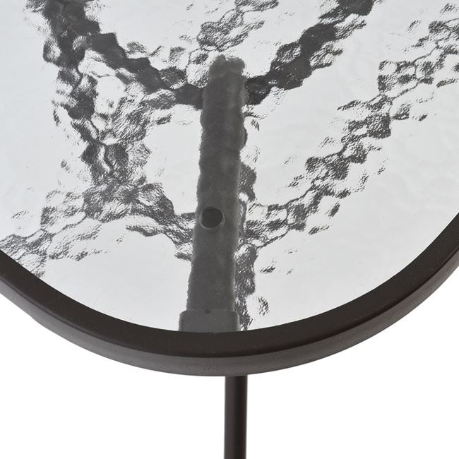 Ένα τραπέζι μεταλλικό εξωτερικού χώρου σε χρώμα καφέ, με ενσωματωμένο τζάμι ασφαλείας (secure).