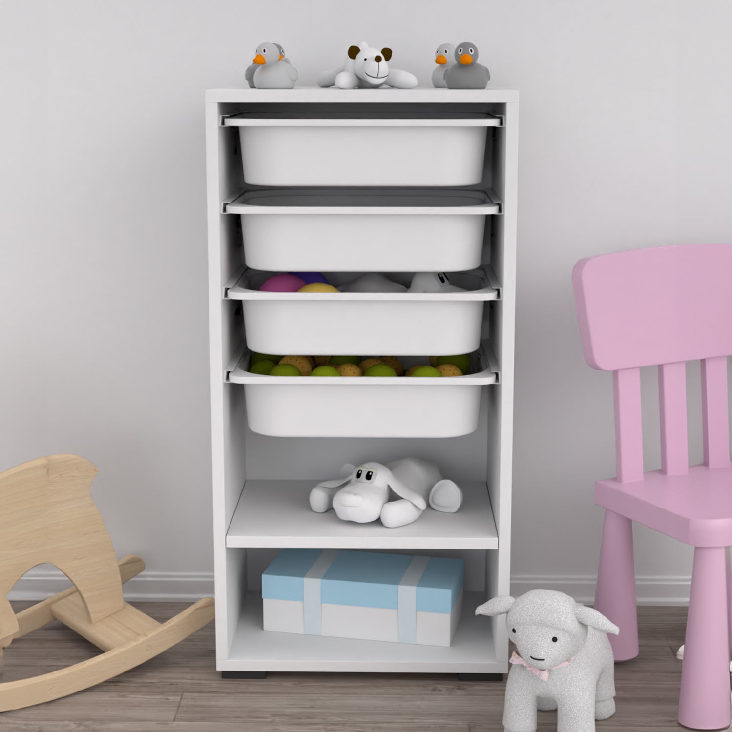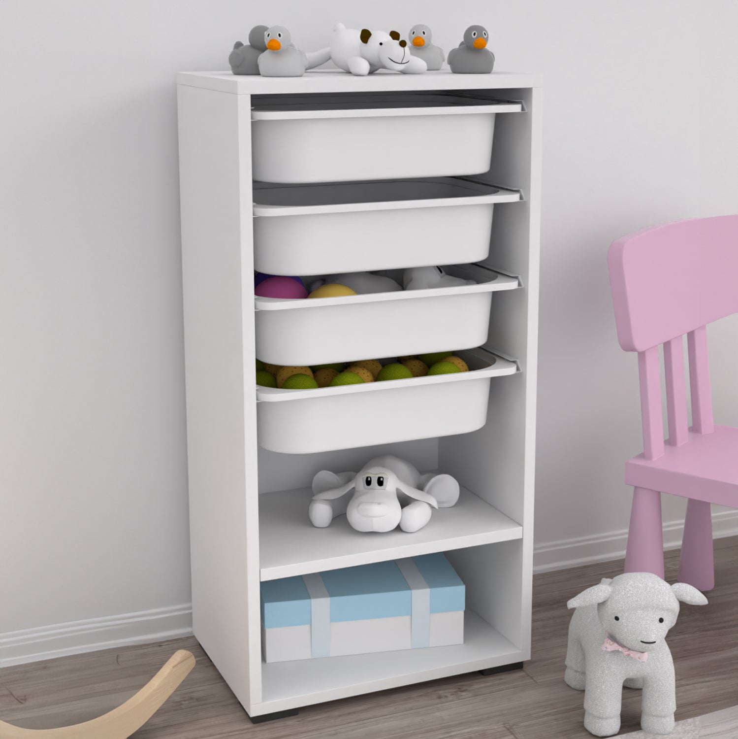 Η SANI είναι μια συρταριέρα με πλαίσιο από μελαμίνη σε χρώμα ΛΕΥΚΟ, με 4 ΛΕΥΚΑ συρτάρια από πολυαιθυλένιο (πλαστικό) και ένα ανοιχτό ράφι στο κάτω μέρος. Ιδανική συρταριέρα για την καλύτερη οργάνωση του παιδικού δωματίου.