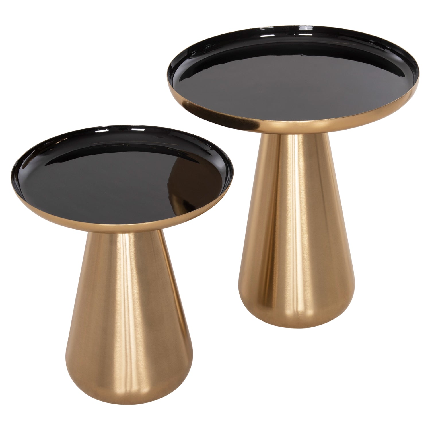 Το σετ 2 τραπεζιών OLUF για το σαλόνι είναι μια από τις νέες προσθήκες στην γκάμα μας. Πρόκειται για 2 μεταλλικά τραπεζάκια στρογγυλά με κωνική βάση σε ΧΡΥΣΟ γυαλιστερό χρώμα. Οι επιφάνειες είναι glossy ΜΑΥΡΕΣ και έχουν χρυσή περίμετρο. Ιδανικά τόσο για το σπίτι, όσο και για επαγγελματικούς χώρους.